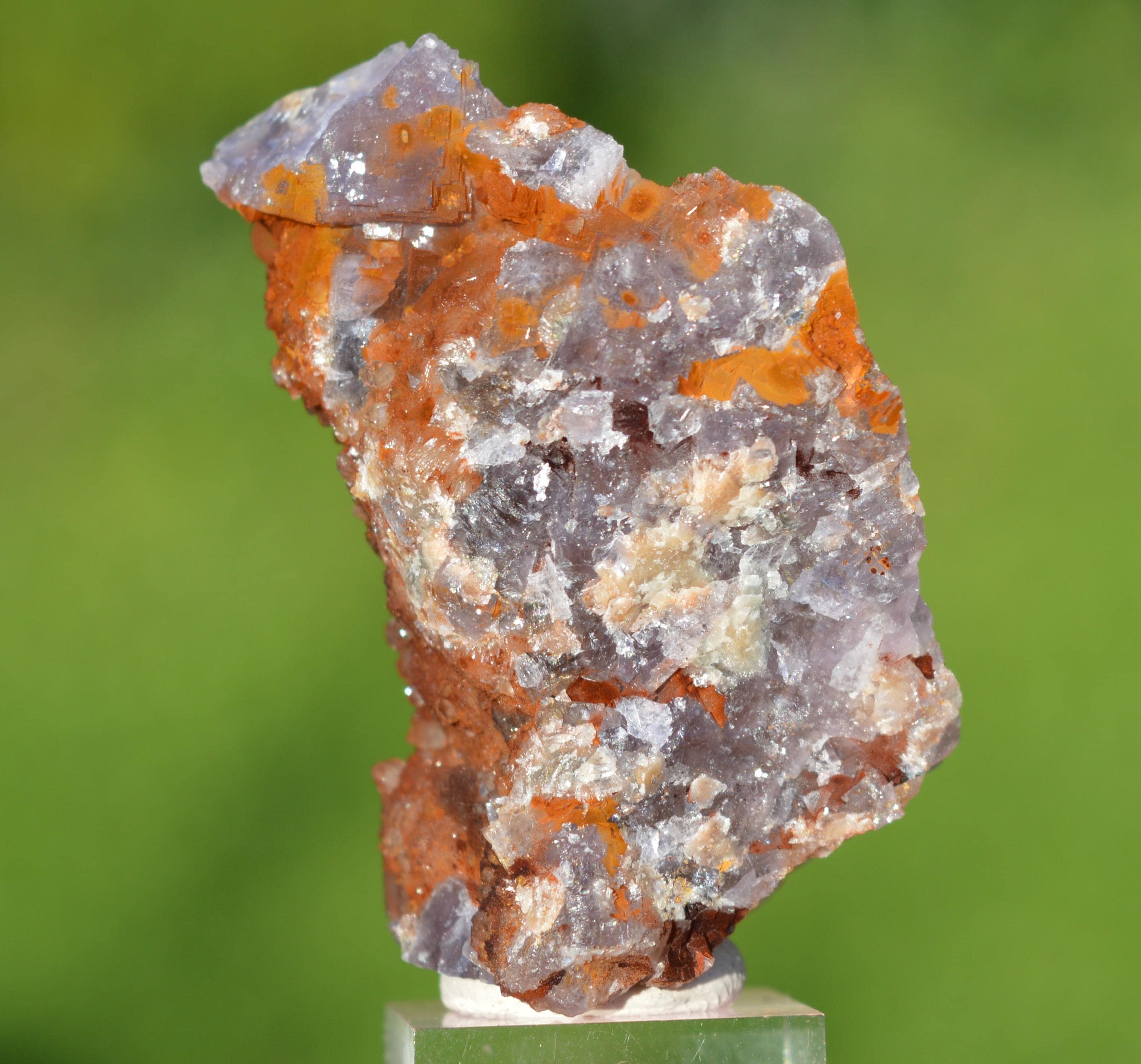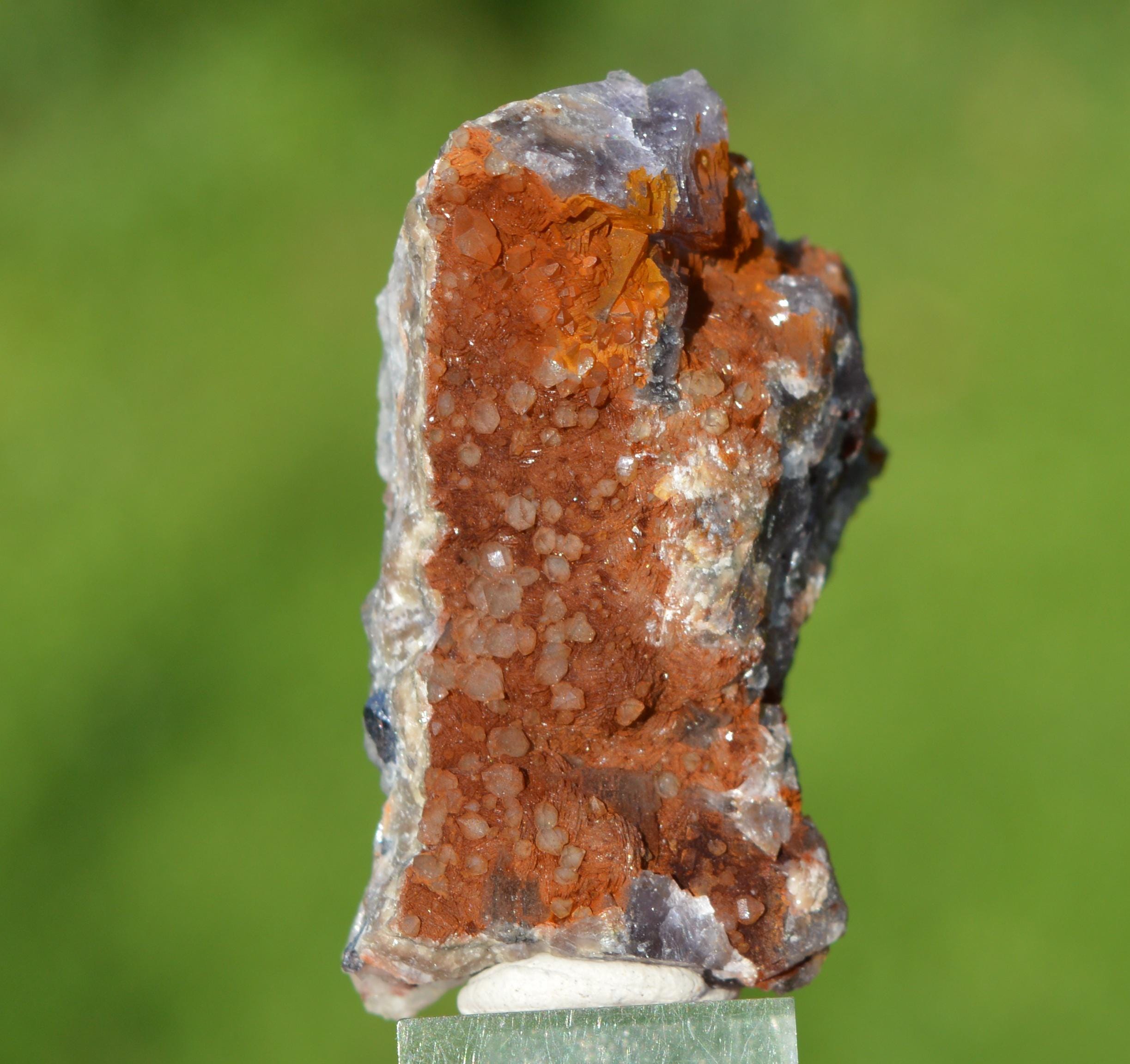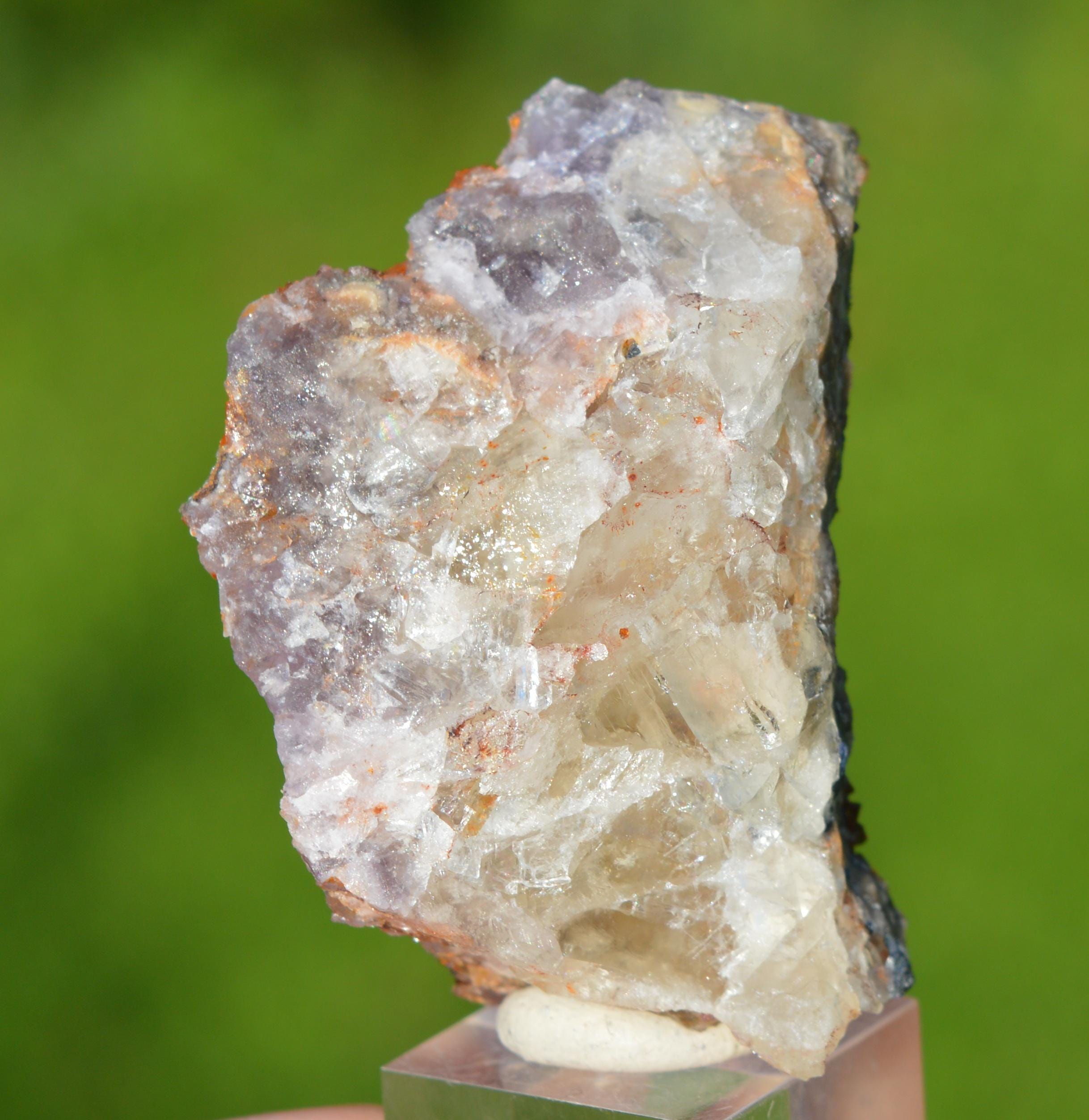 Quartz on barite (tinted red, probably not hematite) on massive fluorite.