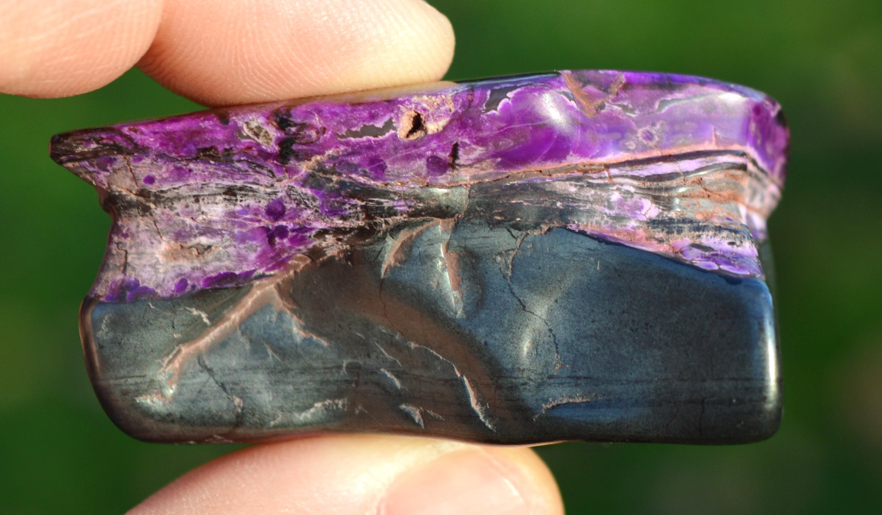 Superb polished sugilite and hematite. Trace of red bustamite (discreet).