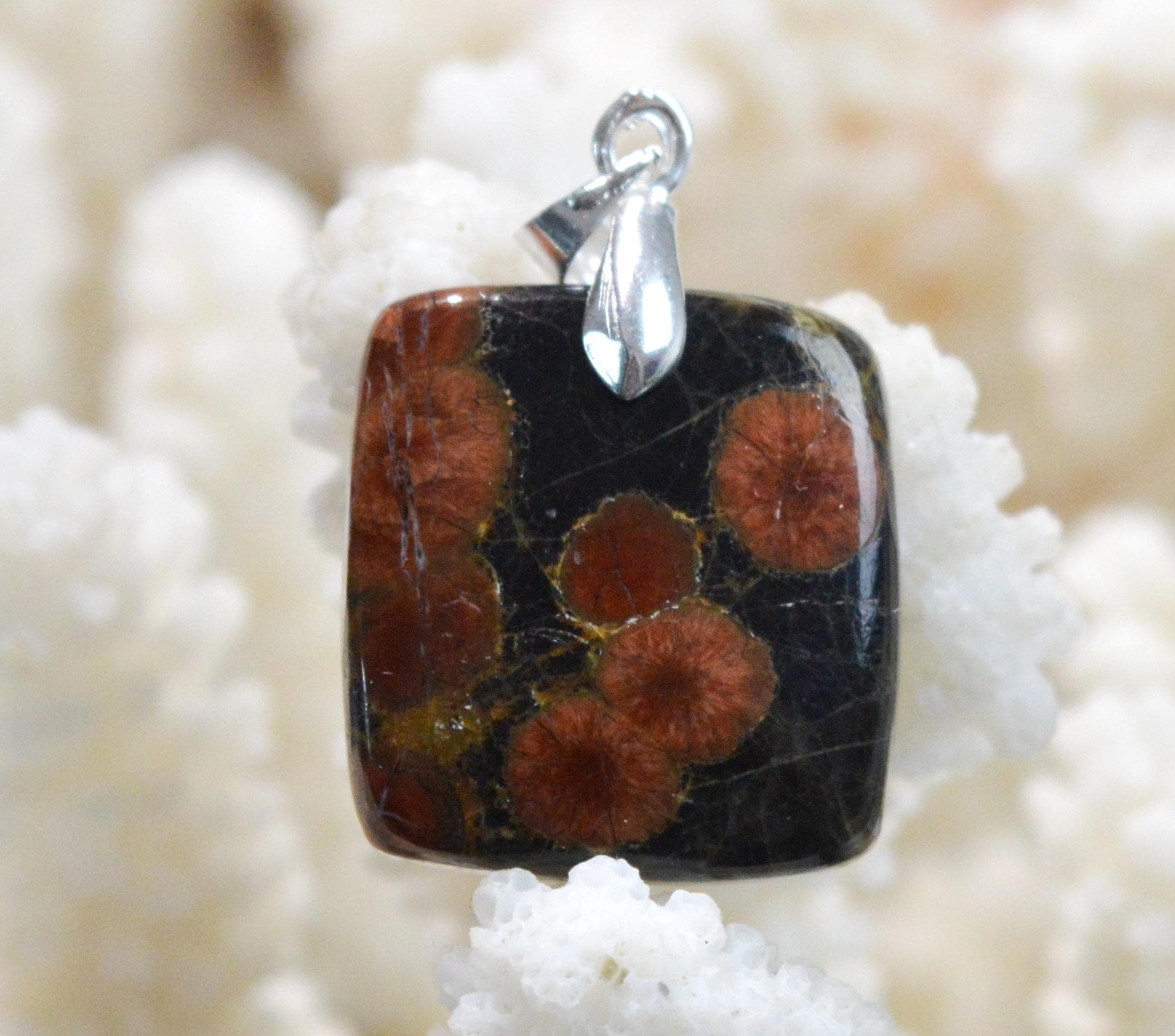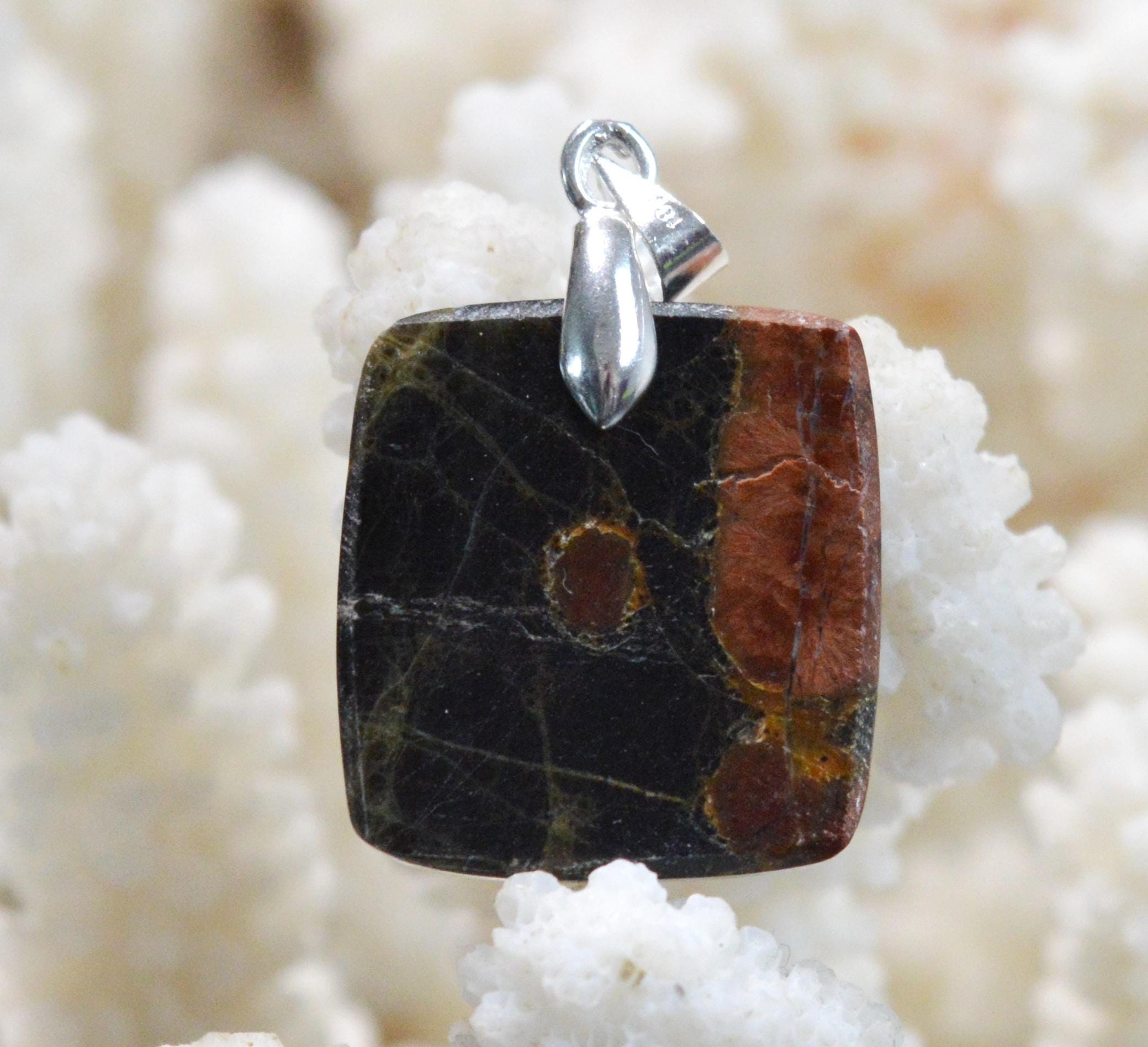 It is distinguished from black obsidian by its inclusion of red felspar which gives it a superb color.