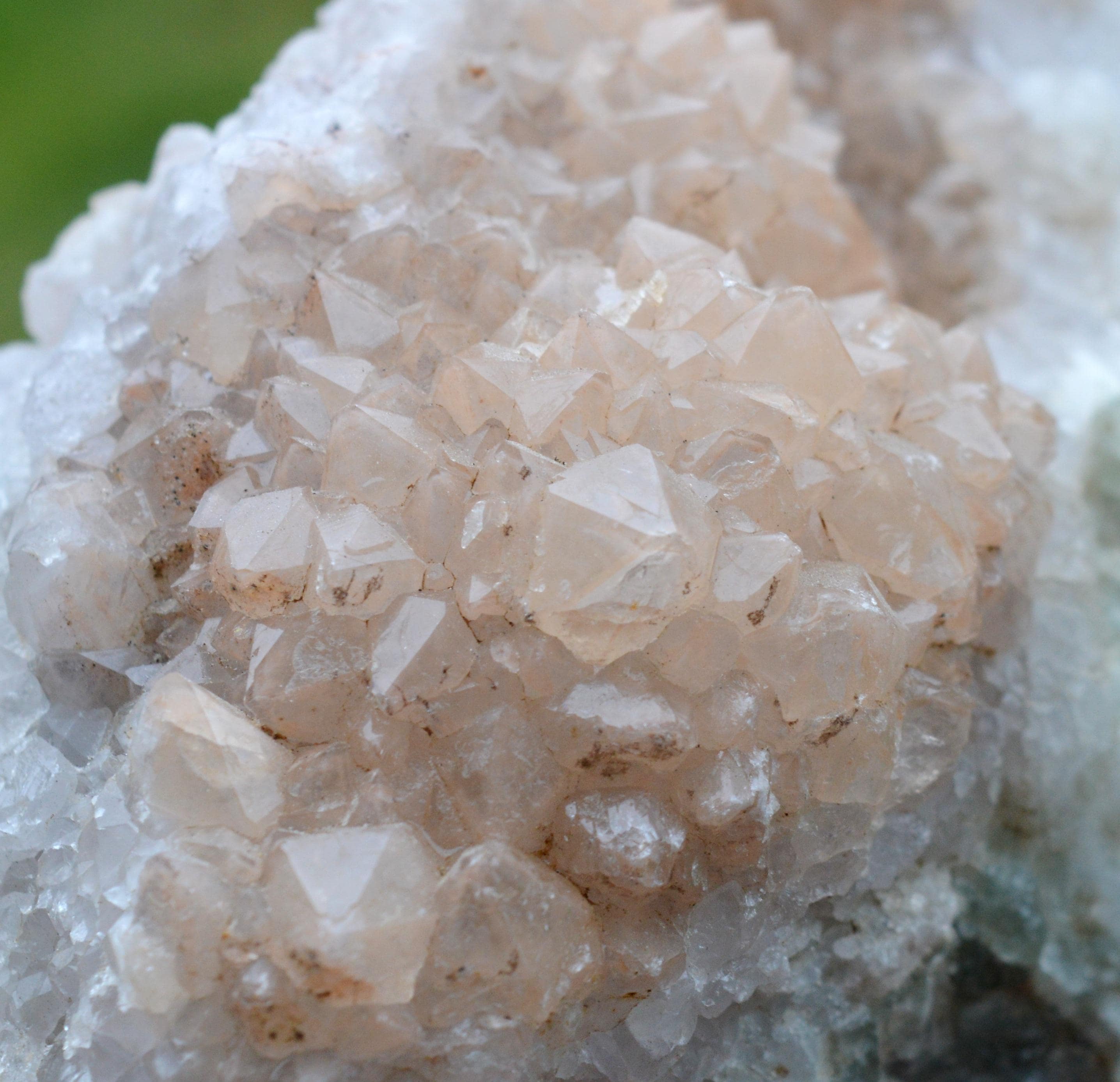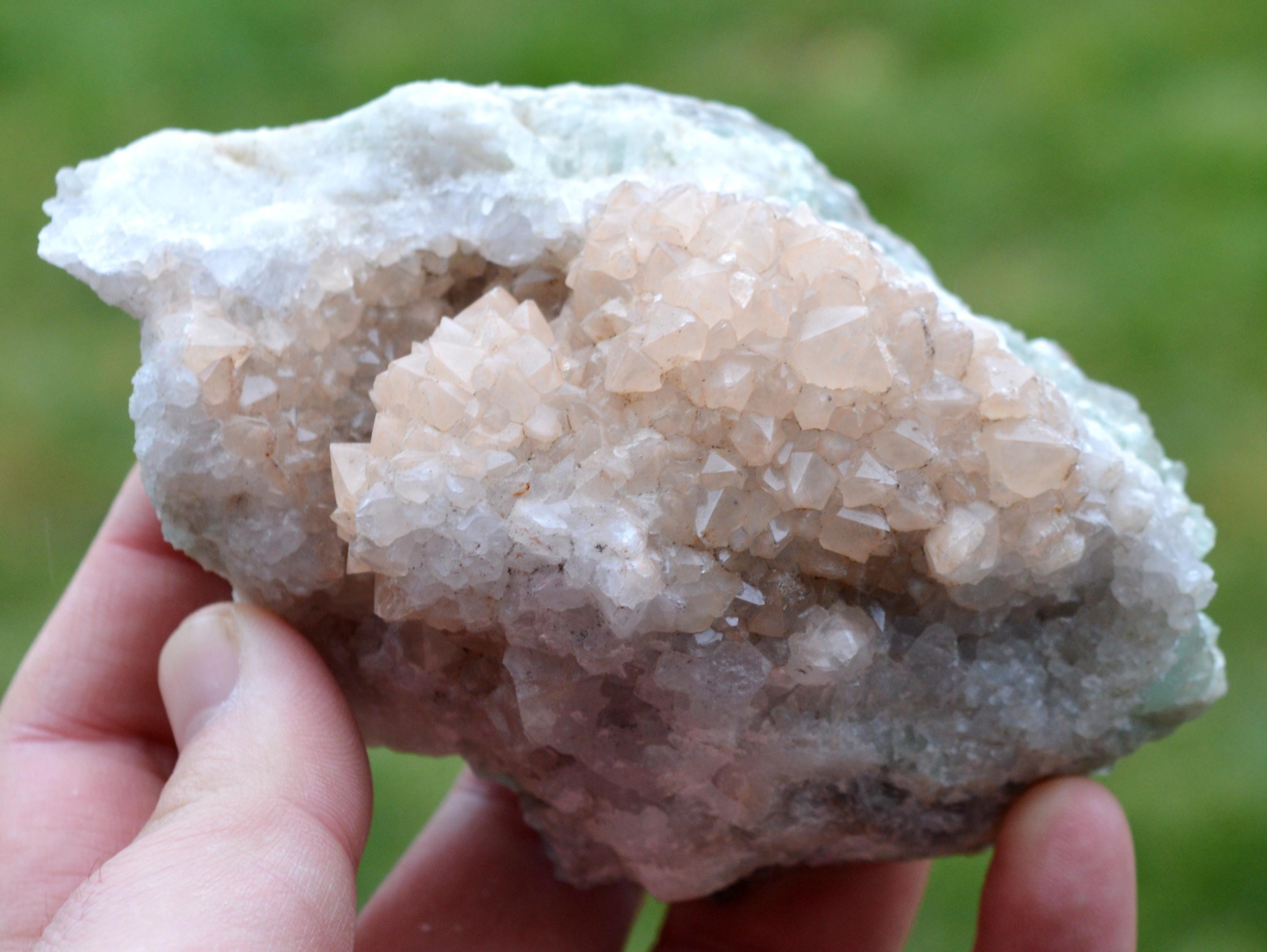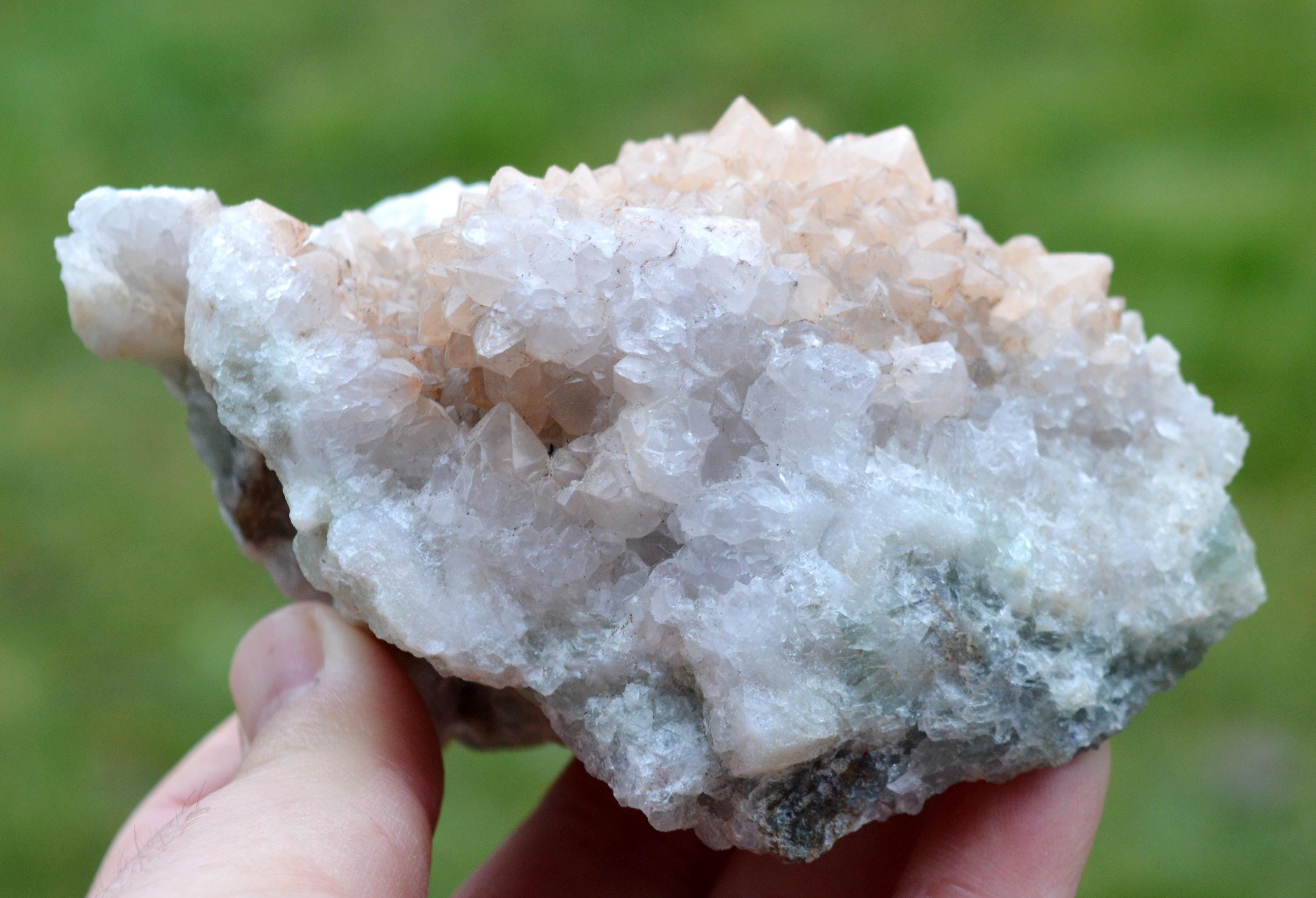 Light hematoid quartz, giving it a particular color, a light pink. On a fluorite matrix.