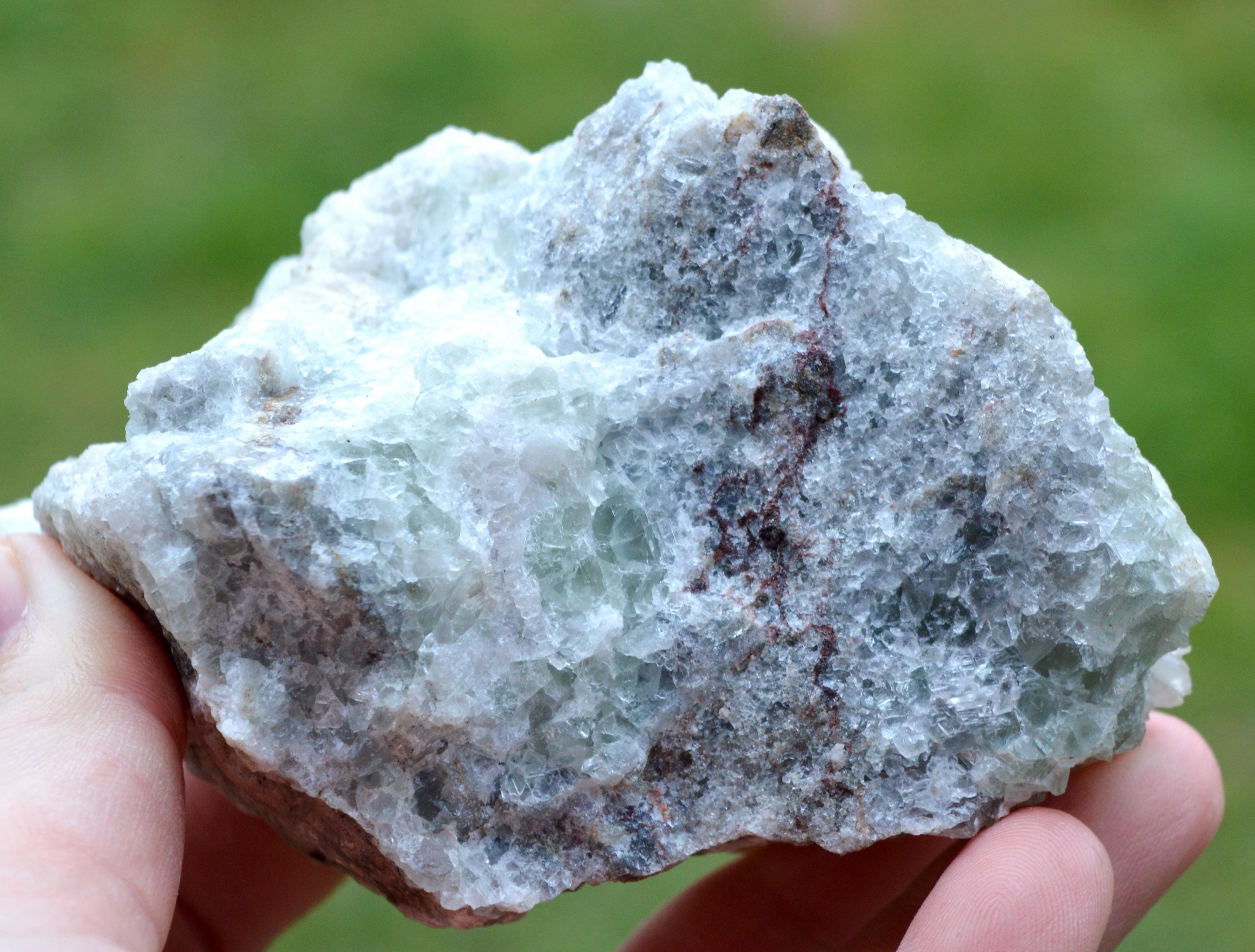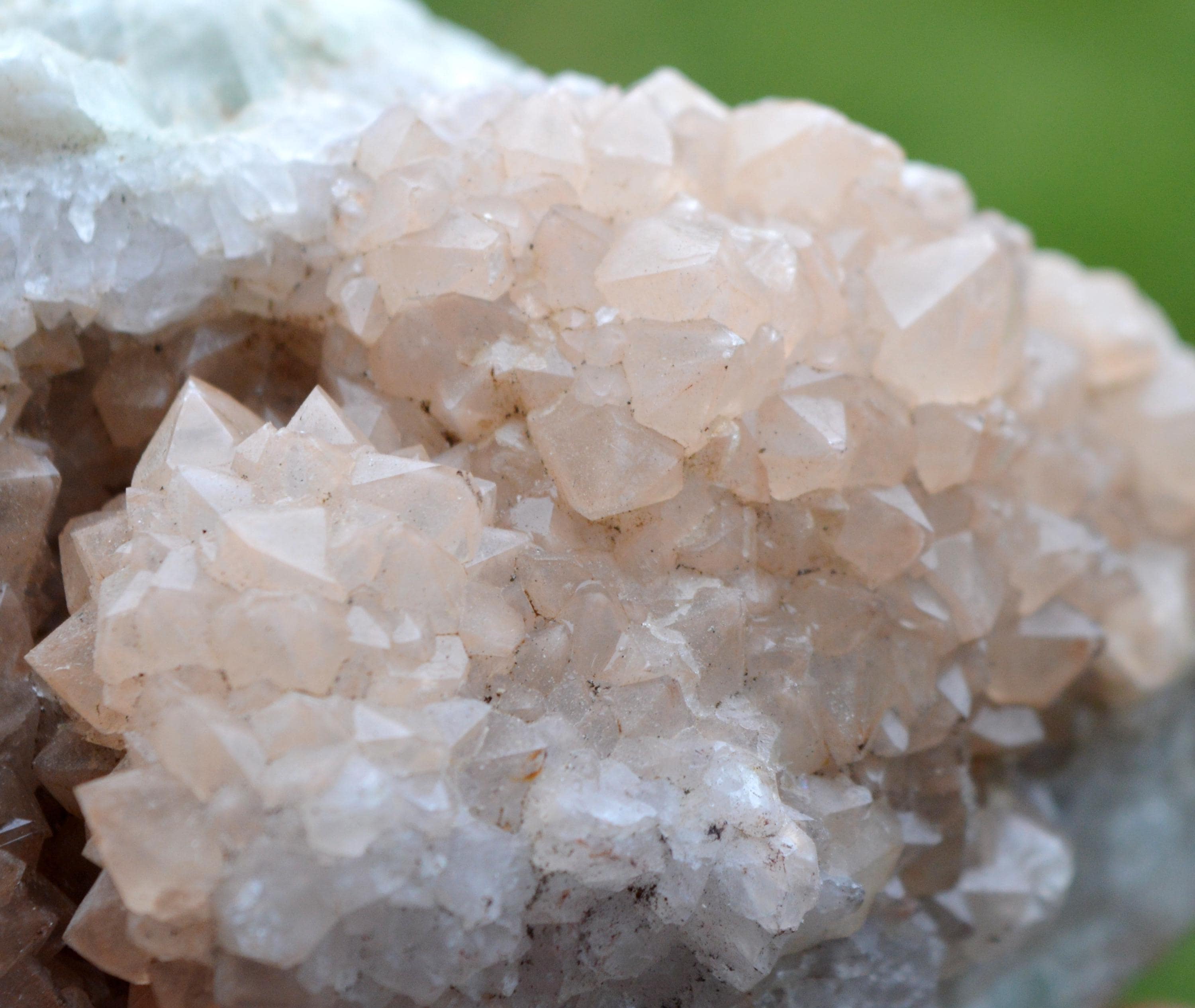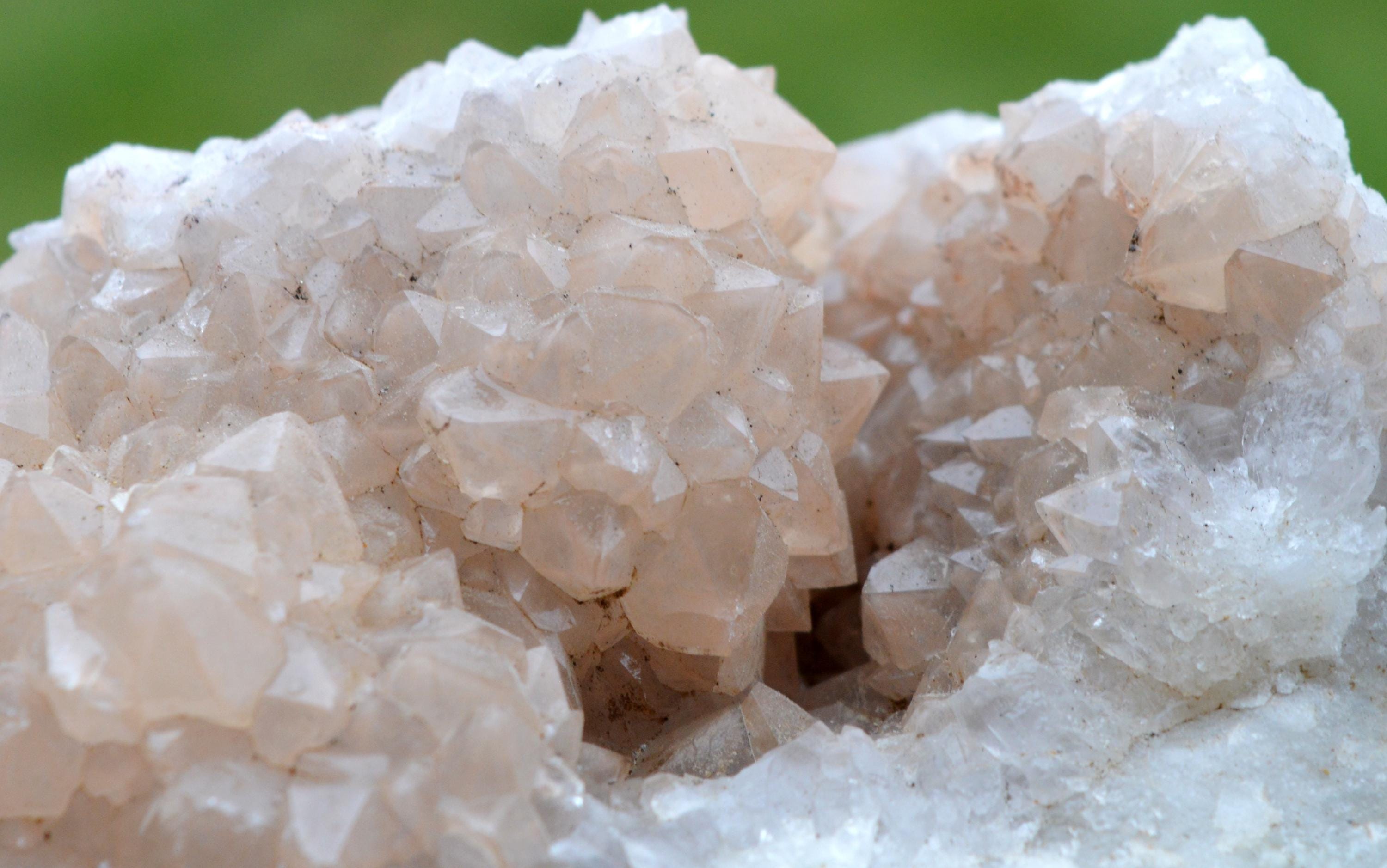 Light hematoid quartz, giving it a particular color, a light pink. On a fluorite matrix.