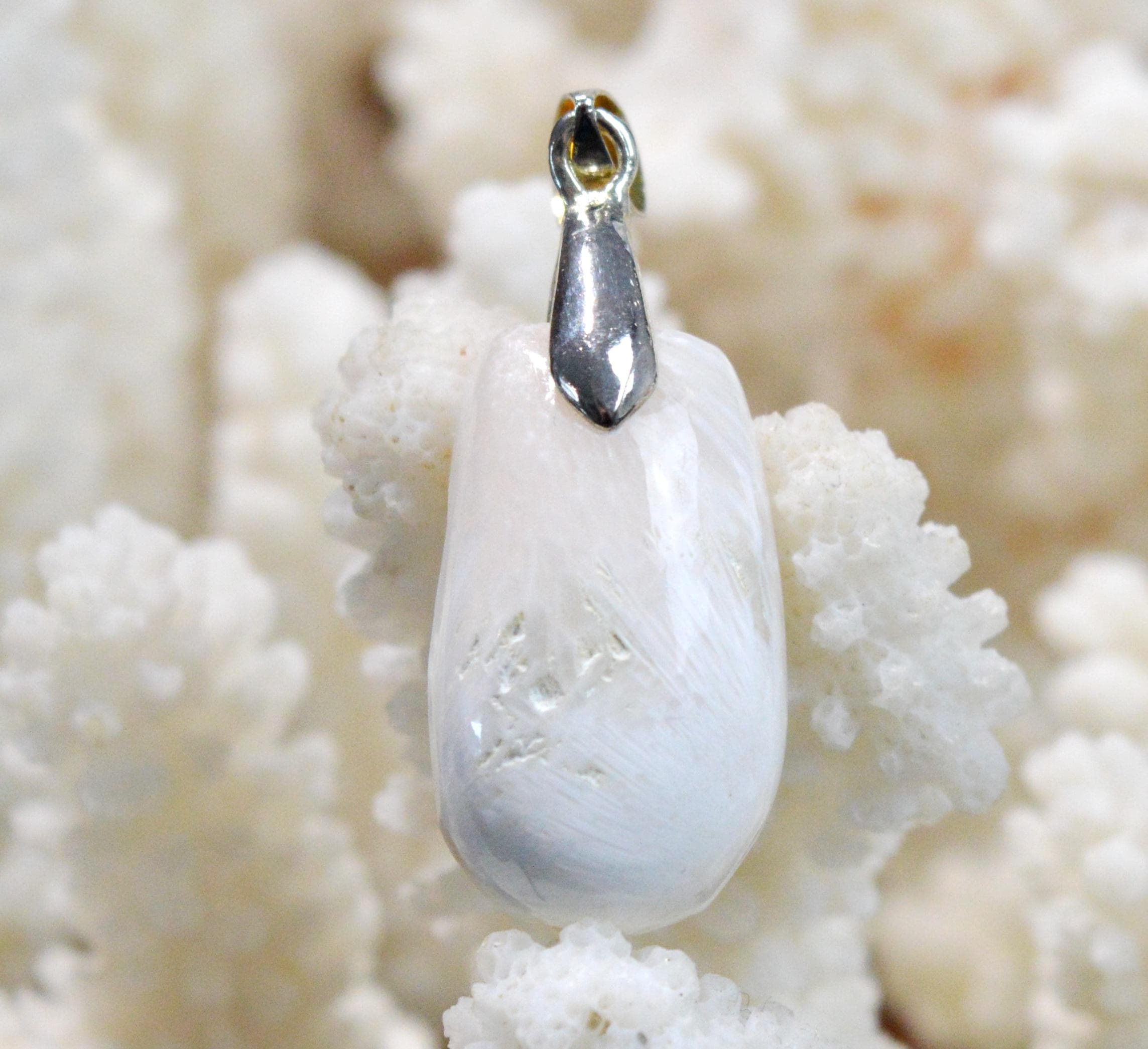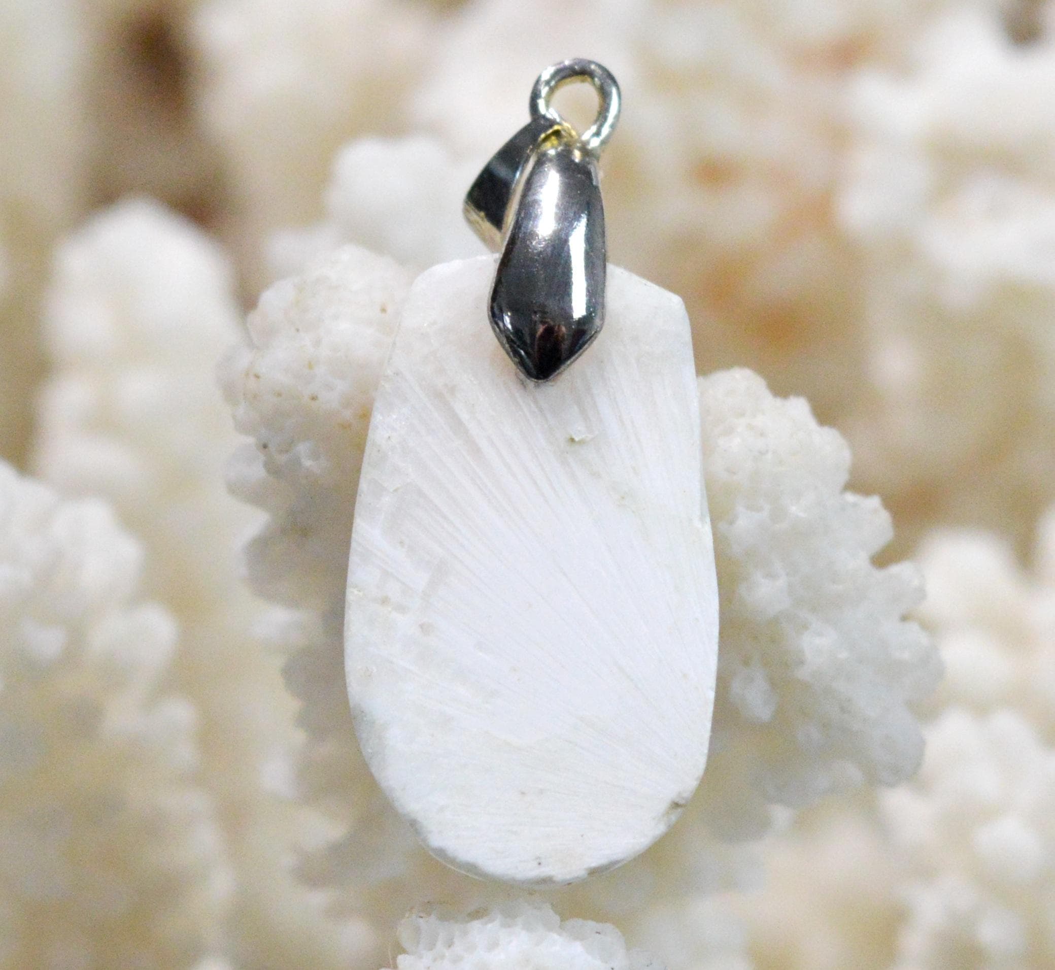 Due to its ability to energetically maintain good functioning of our cardiovascular and cerebral systems, wearing scolecite is recommended for stroke prevention, pancreatic regeneration, spinal realignment, vision improvement, and intestinal balance.