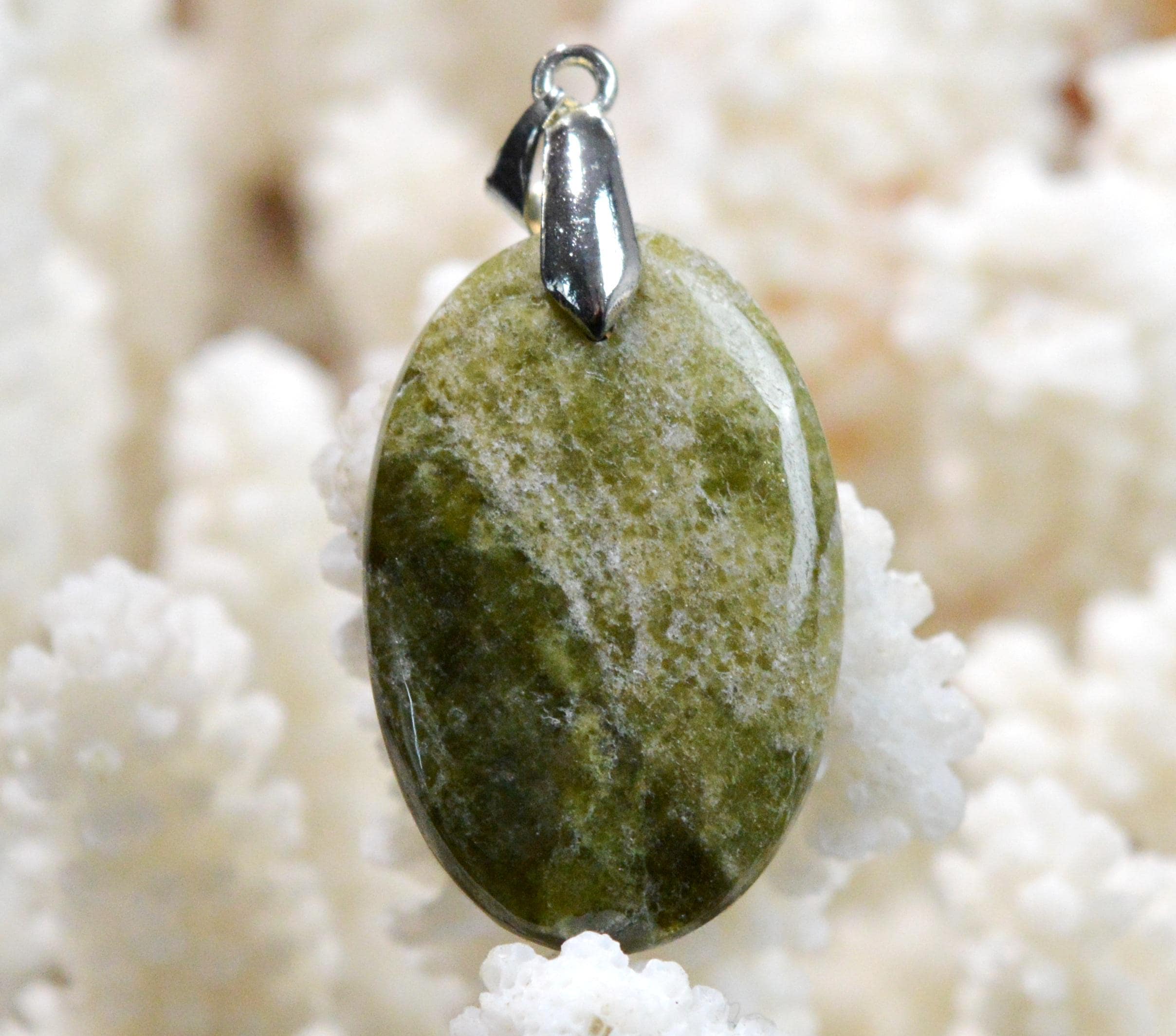 Vesuvianite is said to protect against toothaches by strengthening tooth enamel. It is believed to act on the stomach and intestines, promoting digestion and nutrient absorption. It is also thought to support the pancreas and liver, aiding in the elimination of toxins. Furthermore, it is believed to facilitate kidney and bladder function. It is also said to balance eating habits. An interesting effect of vesuvianite is its purported ability to restore or refine the sense of smell. Women are believed to benefit from it by improving the regularity of their menstrual cycles. Vesuvianite is said to reduce the effects of stress and the physical problems it causes, such as eating disorders and heart rhythm disturbances. It is believed to contribute to good blood circulation and healthy blood pressure. In general, it is thought to strengthen the entire body, particularly the lower limbs.