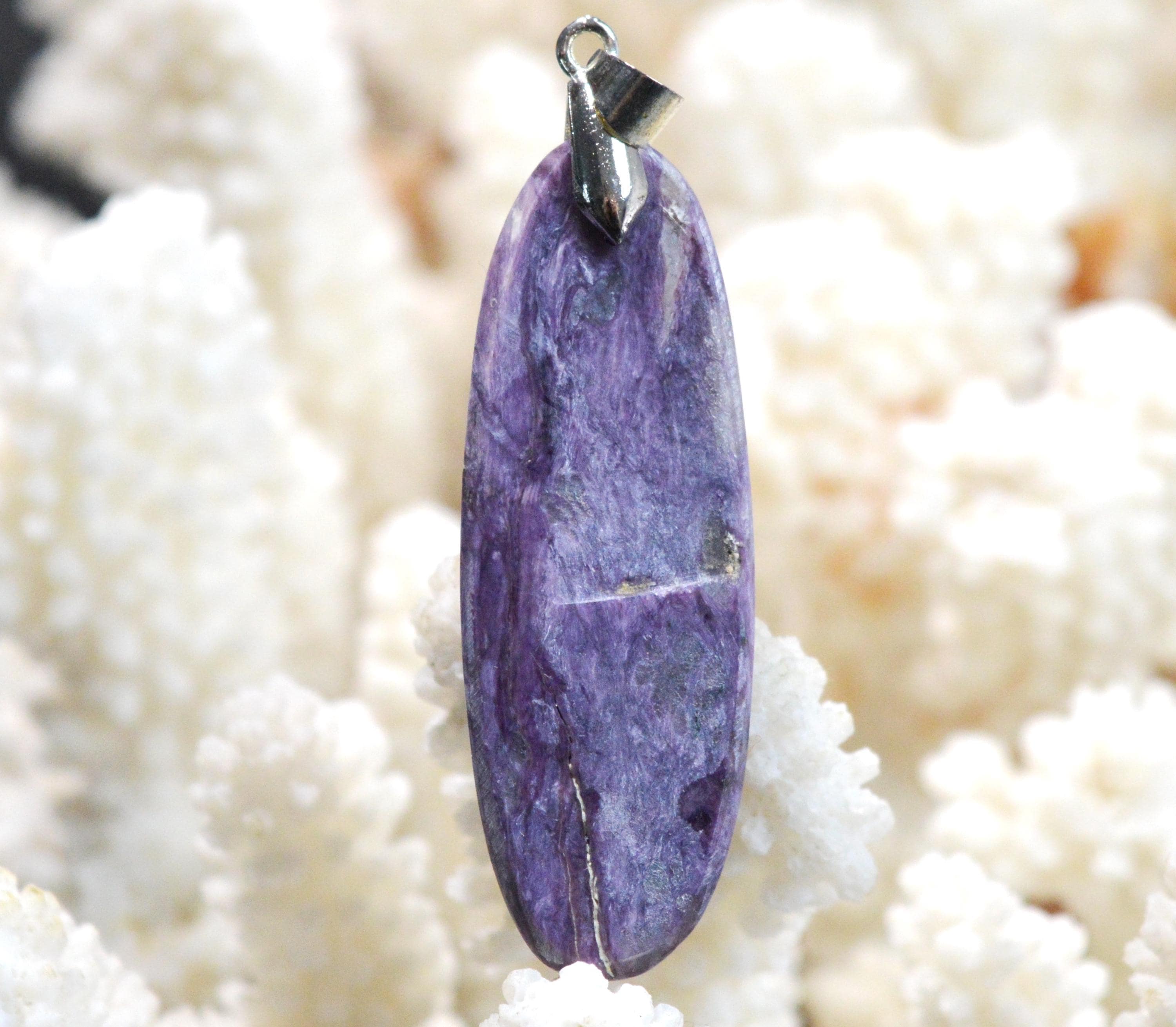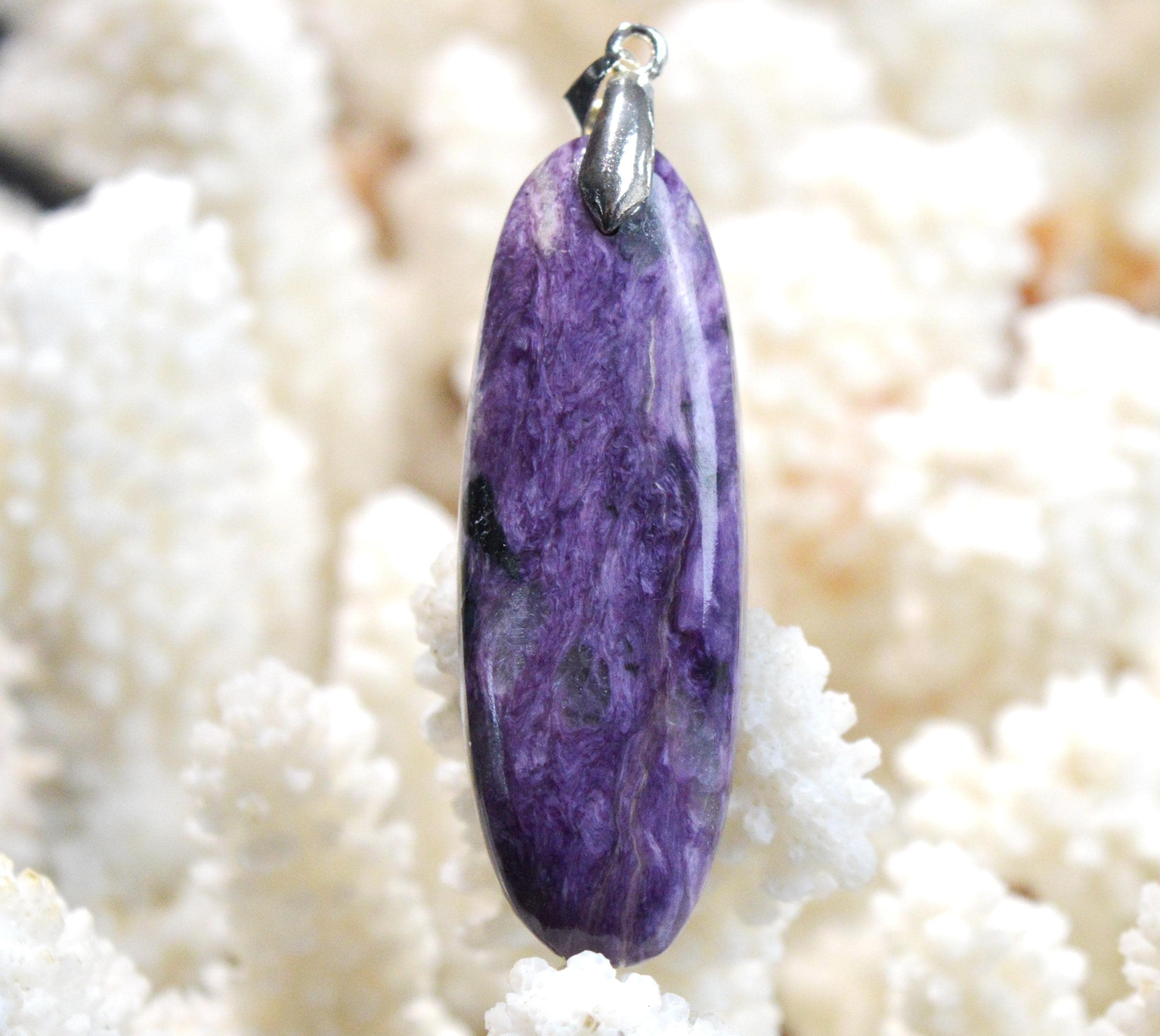 La pierre charoïte (qui se prononce tcharoïte) est un minéral du groupe des silicates sous-groupe des inosilicates de code K5Ca8 (Si6O15) 2 (Si2O7) Si4O9 (OH)·3 (H2O). Elle dispose également quelques traces de Fe, d’Al, de Mn, de Ba et de Sr. La charoïte est un minéral plat qui appartient à la grande famille des silicates, disposant des traces de métaux comme le baryum, l’aluminium, le fer ou encore le manganèse. Associée à plusieurs éléments tels le potassium ou le carbone, elle se forme dans les massifs calcaires, à des températures élevées de 200 à 250 degrés. La couleur de la pierre peut changer entre le violet, le lilas et le brun. Elle dispose d’un code cristallin monoclinique, d’un trait blanc, ainsi que d’un éclat vitreux ou encore nacré dans certains cas. En ce qui concerne sa densité, elle est de 2.54 à 2.58 ; sa dureté, elle, est de 5 à 6 sur l’échelle de Mohs.