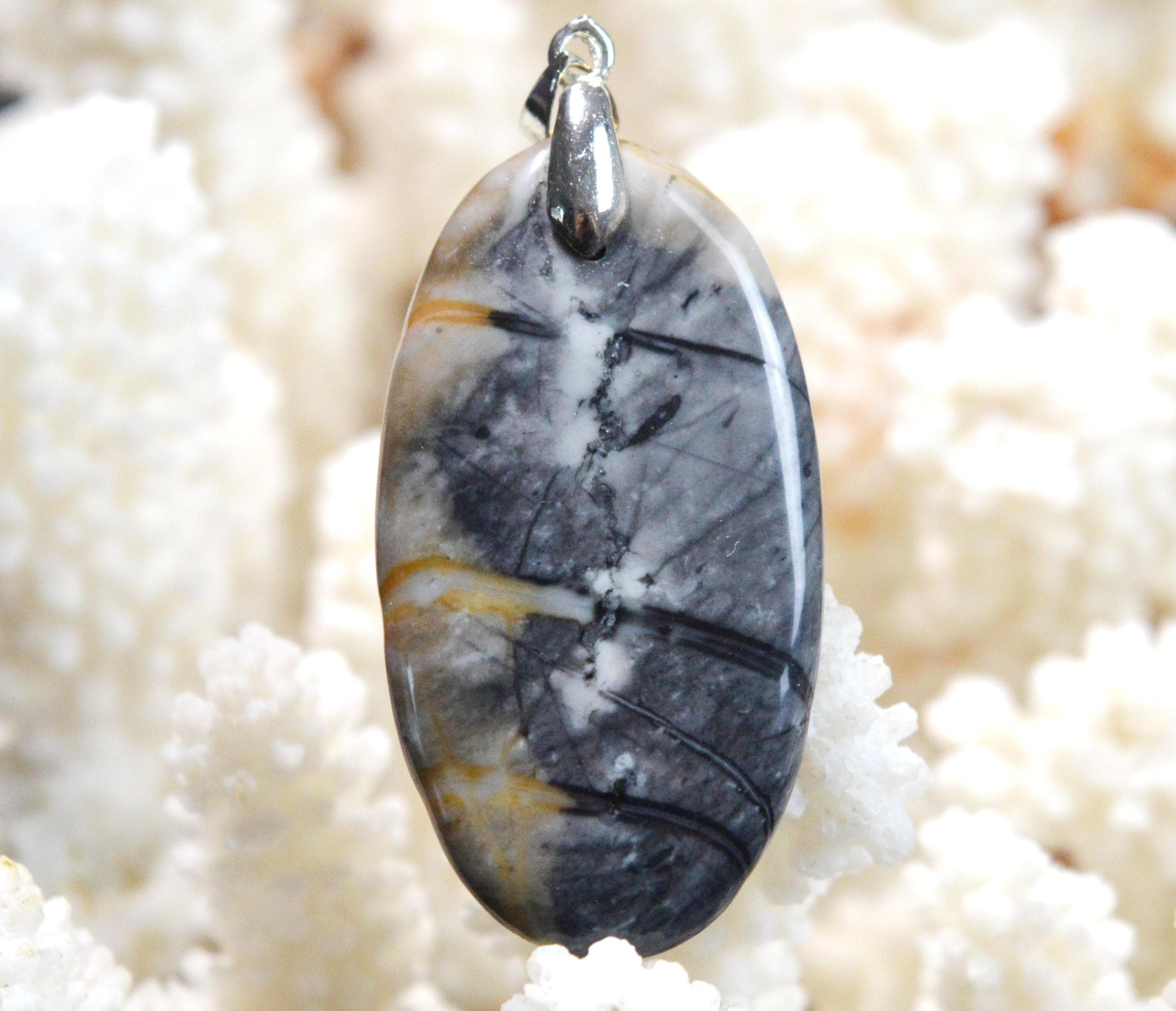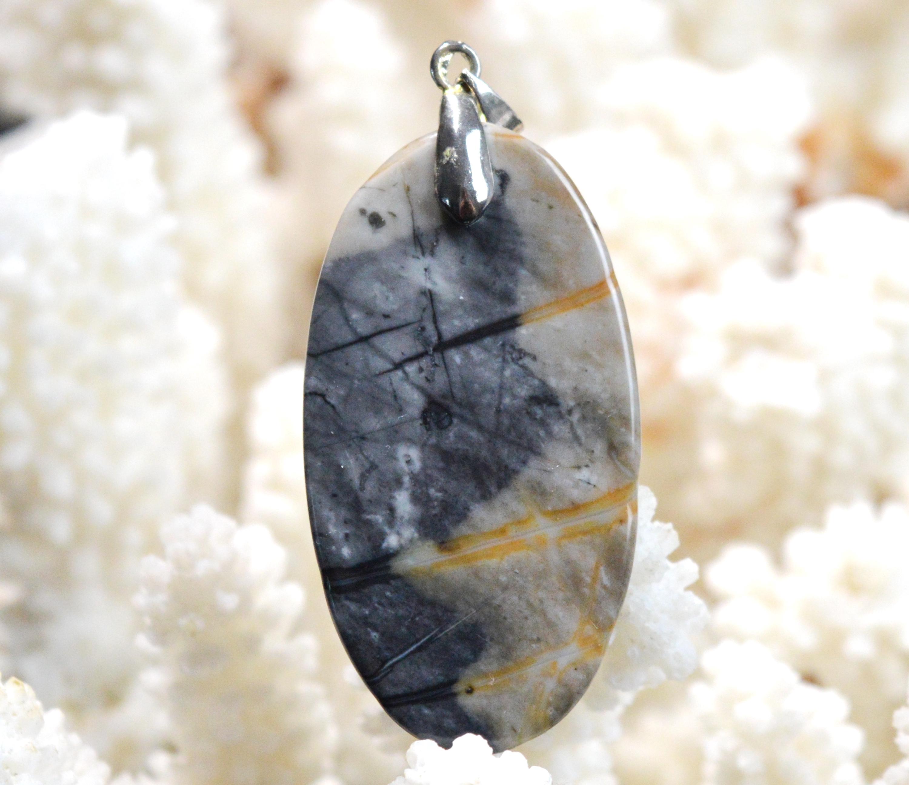 Picasso jasper, also called Picasso marble, is a rock formed by the sedimentation of several layers of crystalline materials and sometimes even clay. The stone is composed of limestone containing calcium carbonate. Like all jaspers, Picasso jasper is characterized by a high silica content, reaching up to 95% of its total composition. Picasso jasper is characterized by various shades of gray nuanced by black, beige, brown, red, or blue streaks or spots. The mineralogical characteristics of the stone remain common to jasper, with a scaly to conchoidal fracture. Picasso jasper has a trigonal crystal system, a density of 2.75, and a hardness of 6.5 to 7 on the Mohs scale.