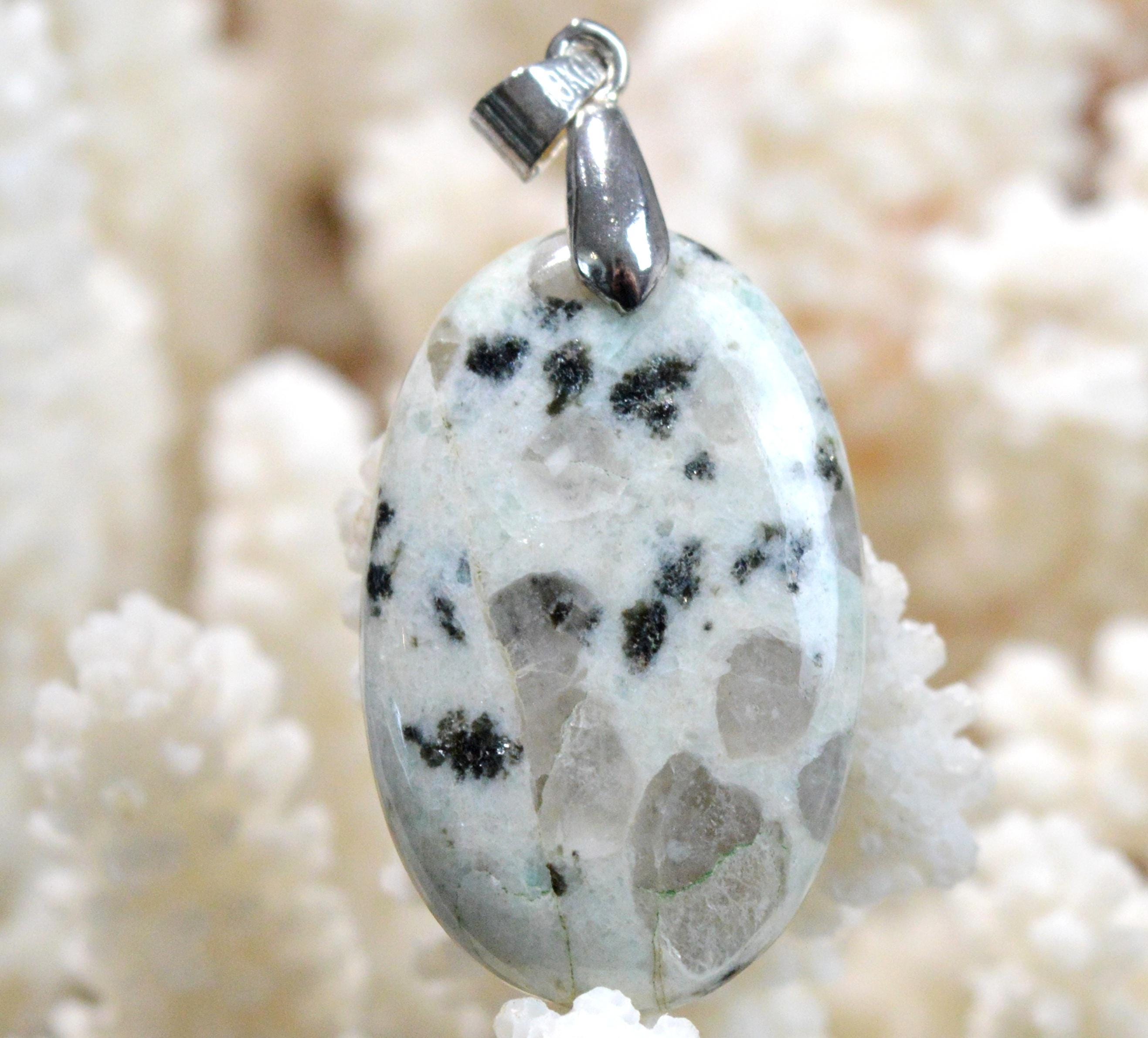 Kiwi jasper, also sometimes called sesame jasper, is not actually a jasper but a pegmatite containing tourmaline (black), smoky quartz, and amazonite (blue streak). It is a very useful stone for calming nerves and all disorders related to mood or mental health (depression, bipolar disorder, etc.).