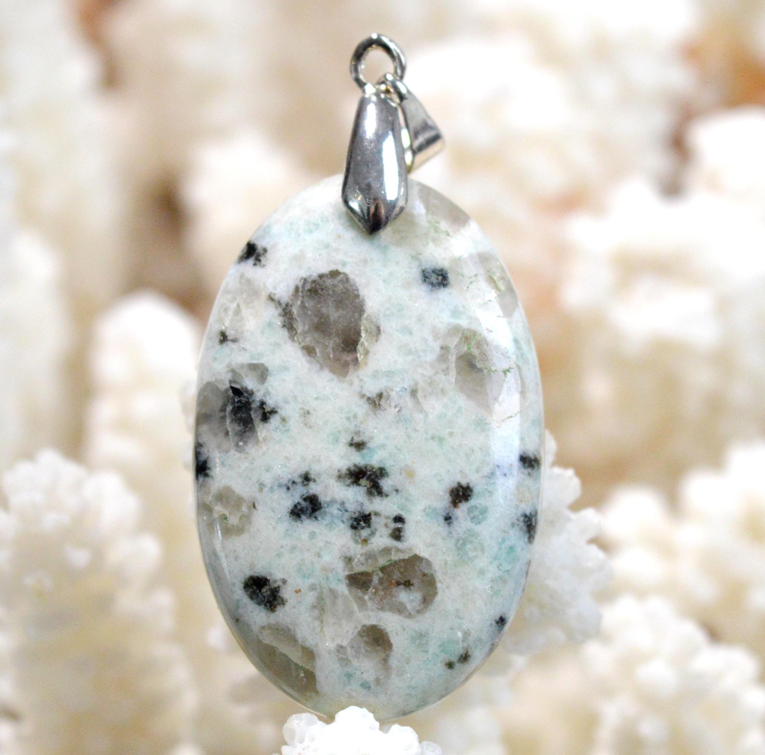 Kiwi jasper, also sometimes called sesame jasper, is not actually a jasper but a pegmatite containing tourmaline (black), smoky quartz, and amazonite (blue streak). It is a very useful stone for calming nerves and all disorders related to mood or mental health (depression, bipolar disorder, etc.).