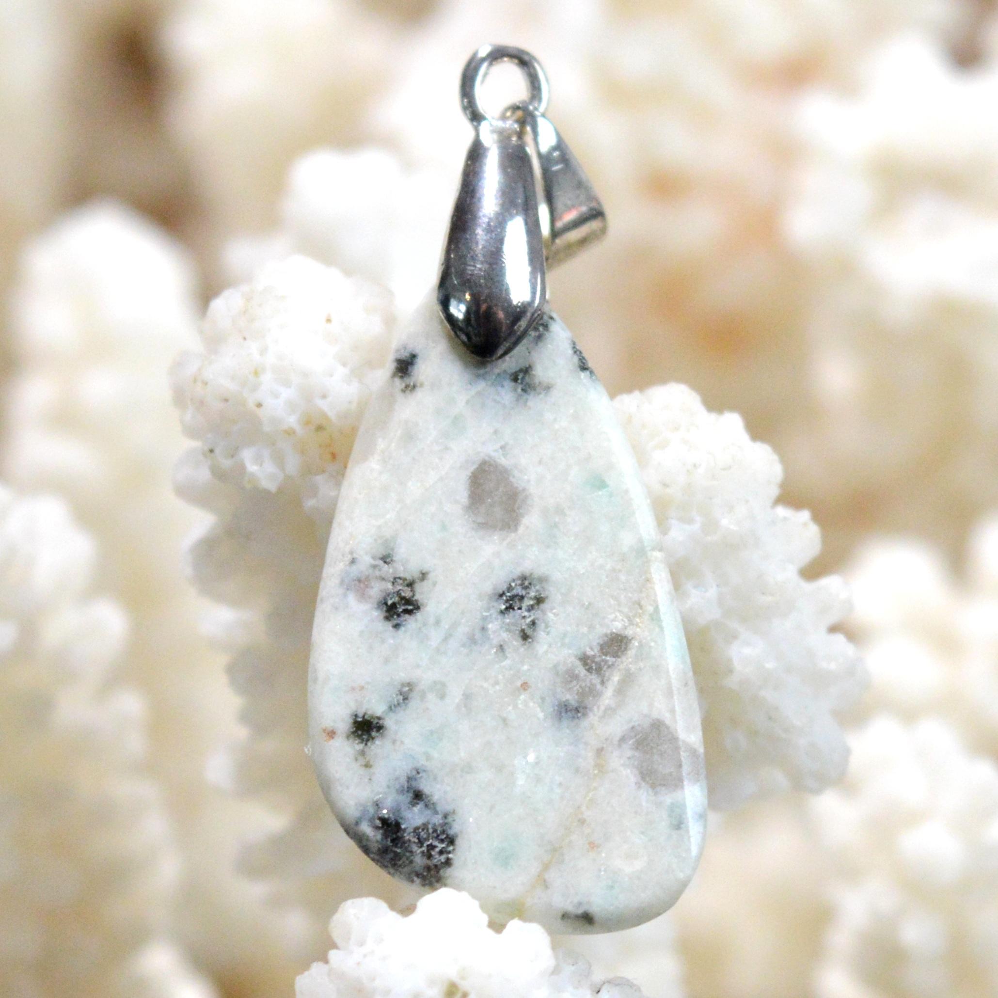 Kiwi jasper, also sometimes called sesame jasper, is not actually a jasper but a pegmatite containing tourmaline (black), smoky quartz, and amazonite (blue streak). It is a very useful stone for calming nerves and all disorders related to mood or mental health (depression, bipolar disorder, etc.).